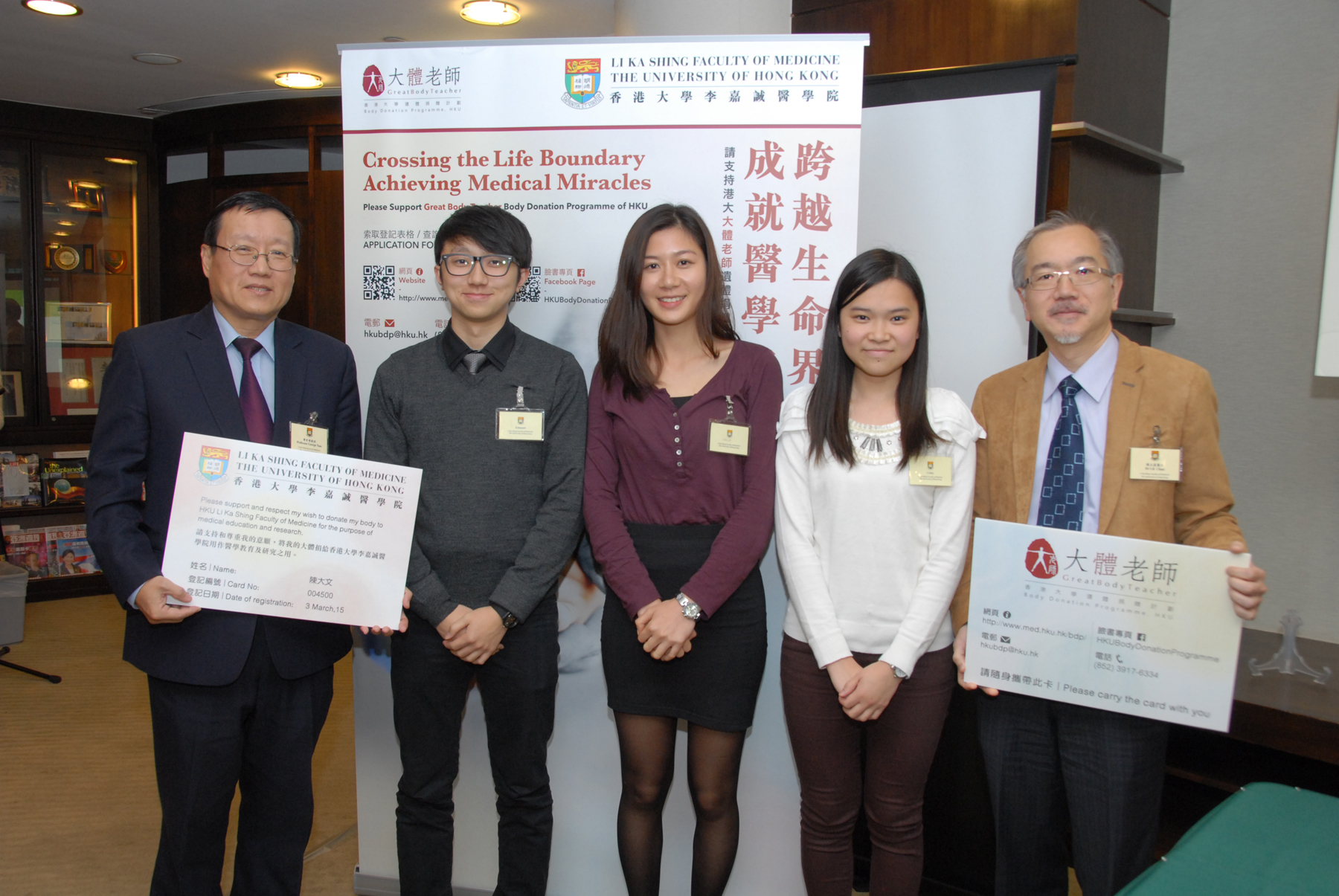 香港大學李嘉誠醫學院解剖學系系主任及教授曹世華教授(左一)及醫學及衞生教育研究所及解剖學系副教授陳立基醫生(右一)與參與記者招待會的醫科生王景楠同學(左二)、劉珮行同學(中)及陳淑玲同學(右二)於活動後合照。
