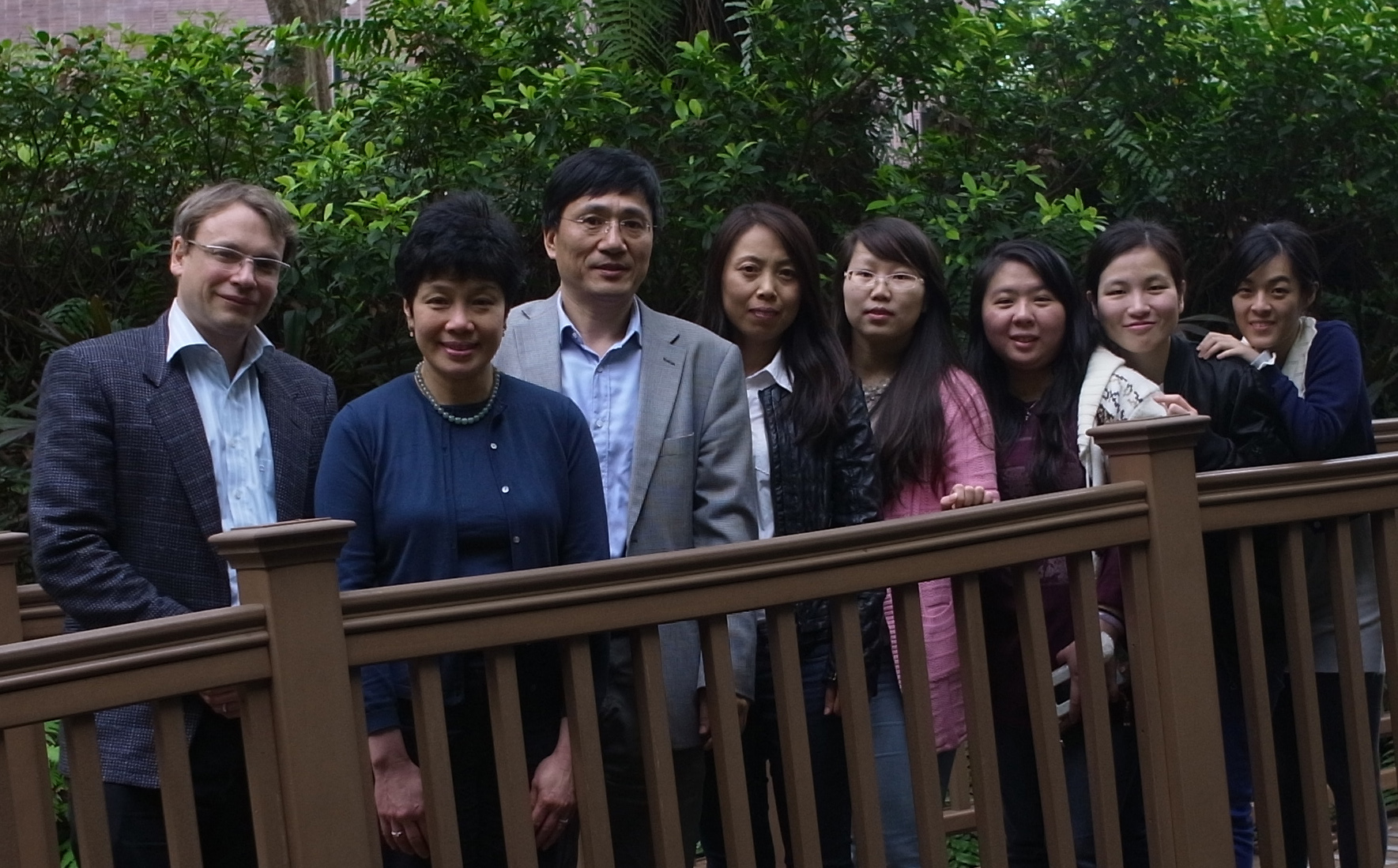 孫紅哲教授及他的香港大學研究團隊 (從左至右):Dr. Julian A. Tanner (生物化學系),黃乾利辛烱僖基金(植物生物技術學)蔡美蓮教授(生物科學學院),孫紅哲教授及化學系研究小組成員:李洪艷博士,研究生陽婭,黎佑芷博士,研究生張苑茵和巢艾倫。