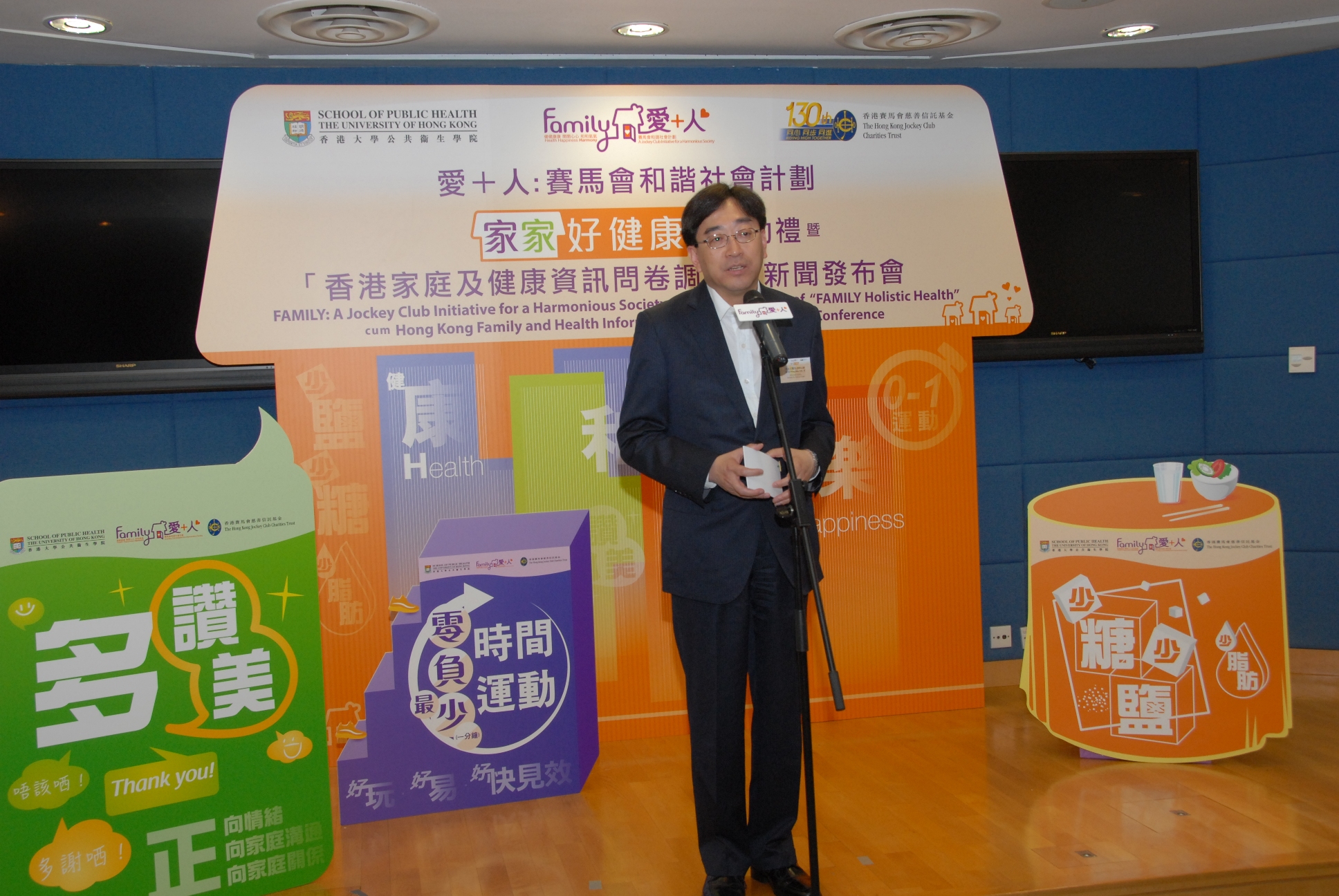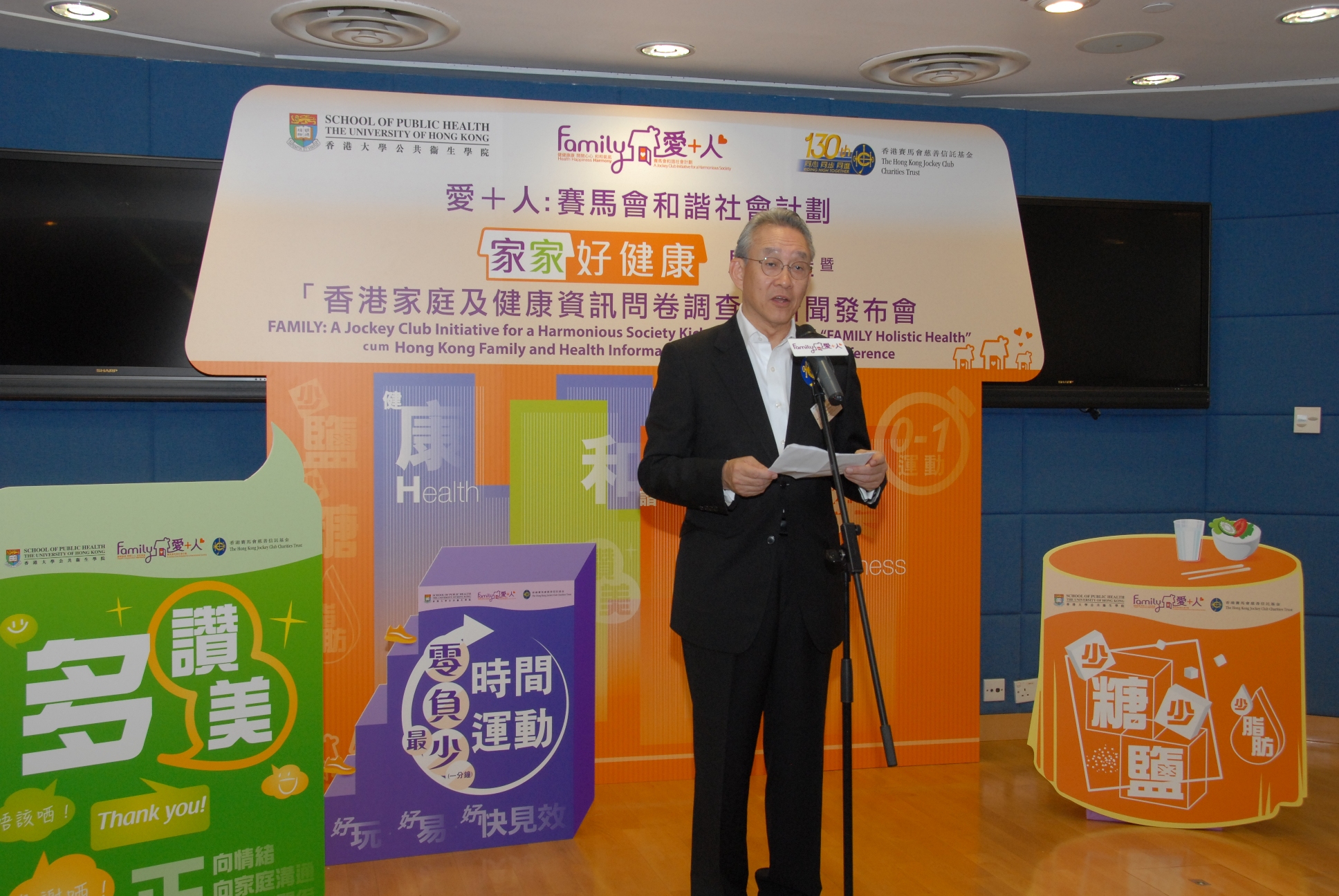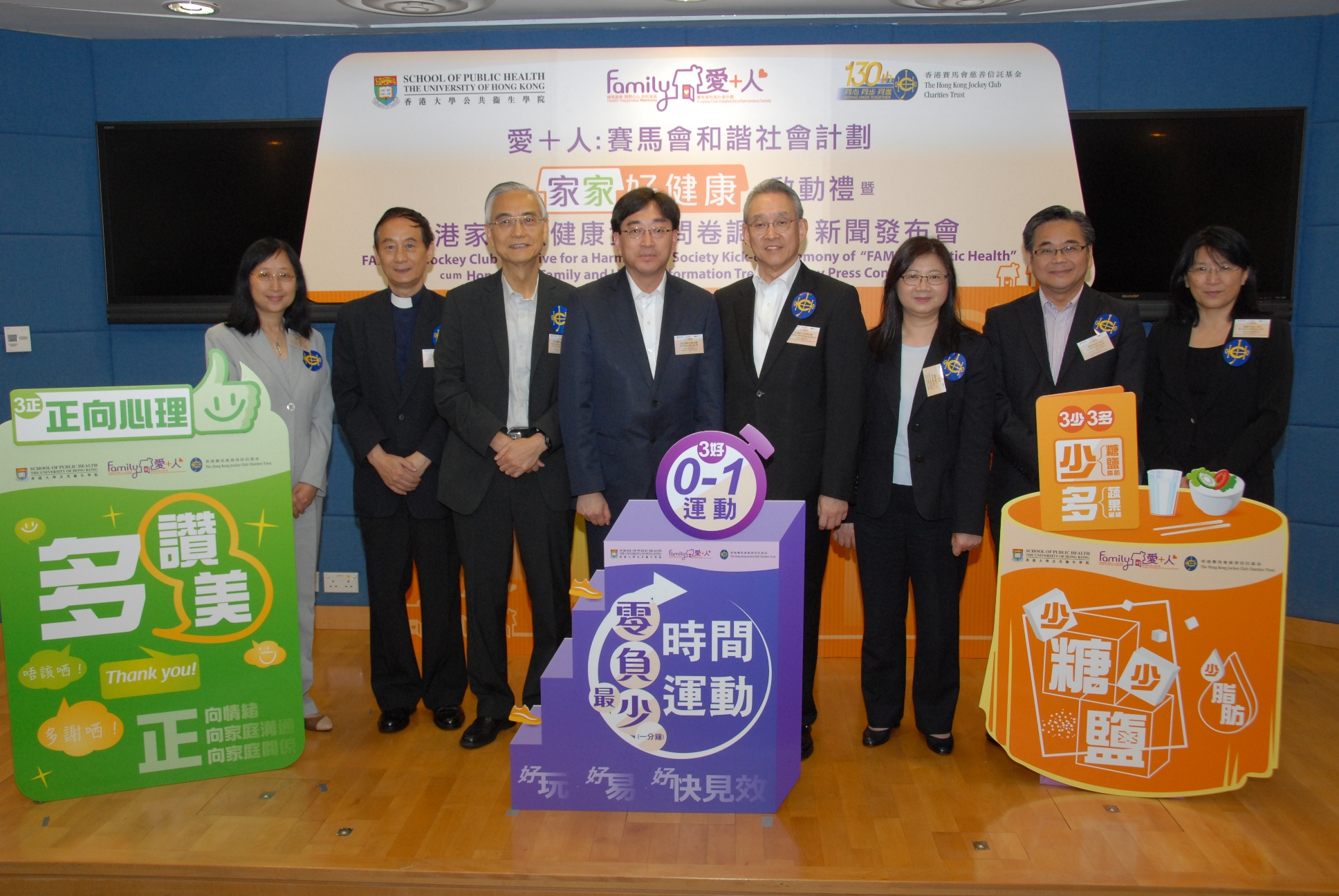 為促進建立和諧社會並宣揚家庭健康、快樂及和諧訊息,由香港賽馬會慈善信託基金主導推行,與香港大學李嘉誠醫學院公共衞生學院(簡稱:港大)攜手合作的「愛 + 人:賽馬會和諧社會計劃」(簡稱:賽馬會「愛 + 人」計劃)之「家家好健康」今日正式啟動,並於發布會公布「香港家庭及健康資訊問卷調查」結果,以及提倡「零時間運動」的嶄新概念,鼓勵市民多做簡單和隨時隨地都可進行的運動。