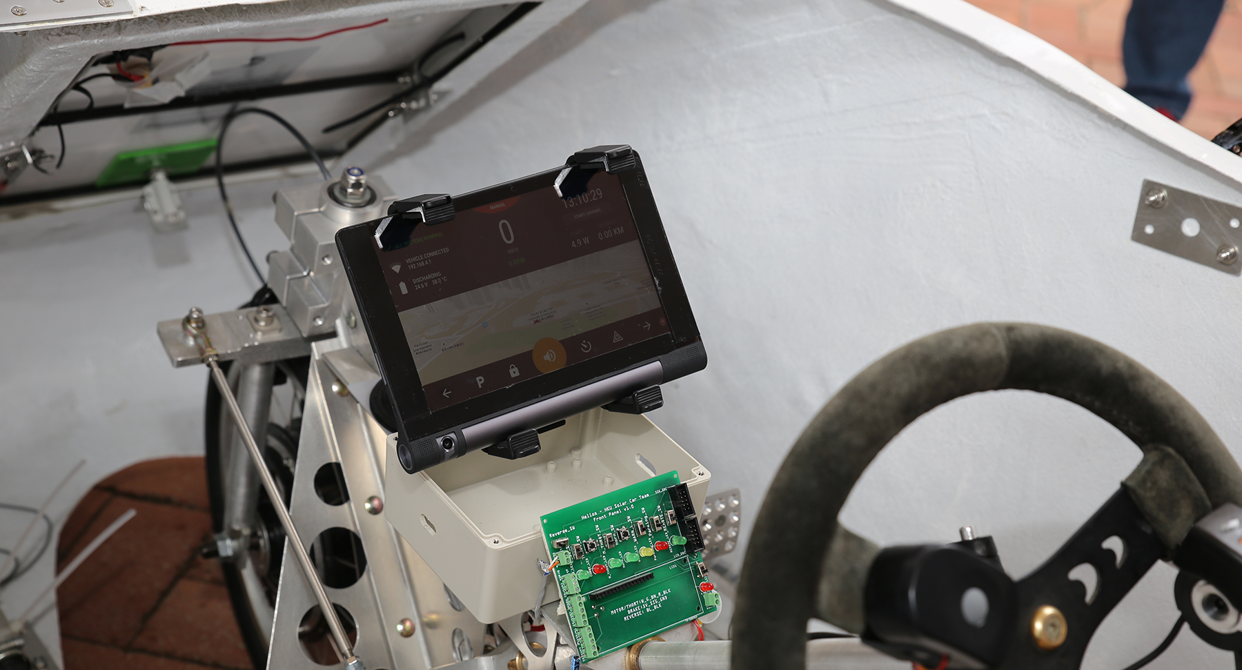 香港大學工程學院學生自行設計的「行車管理電腦」為 Helios 太陽能車之「大腦」。在太陽能車充電及行車時,此電腦會透過車身上的大量感應器監測車輛狀況,保障司機及車輛安全。同時,輕觸式儀表板亦會經此電腦獲取太陽能車之實時數據。