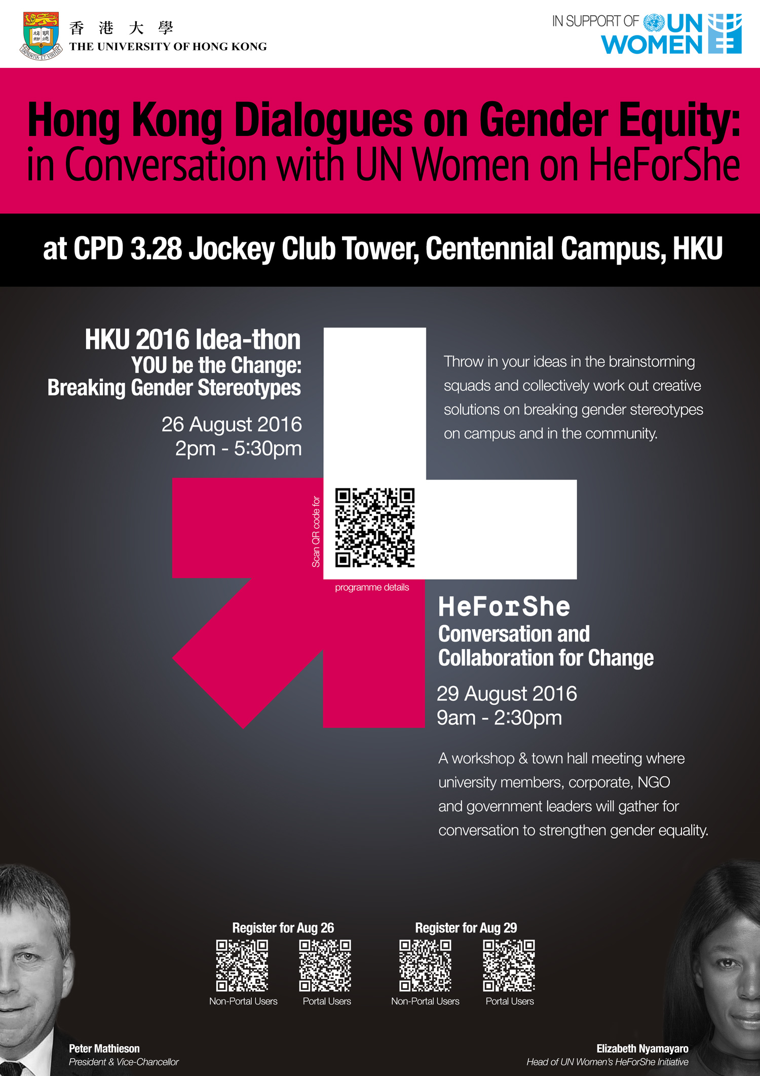 The August series includes: (i) a student-led HKU 2016 Idea-thon on 26 August (Friday) afternoon, facilitated by Ms. Nyamayaro for students to throw in ideas and collectively work out creative solutions on breaking gender stereotypes on campus and in the community, and (ii) a workshop and town hall meeting - HeForShe: Conversation and Collaboration for Change on 29 August (Monday) morning where students, faculty, and administrators from HKU and the Chinese University of Hong Kong (CUHK), along with corporate, non-governmental organisations, and government leaders will gather for collaboration to strengthen HeForShe impact in our homes and institutions.