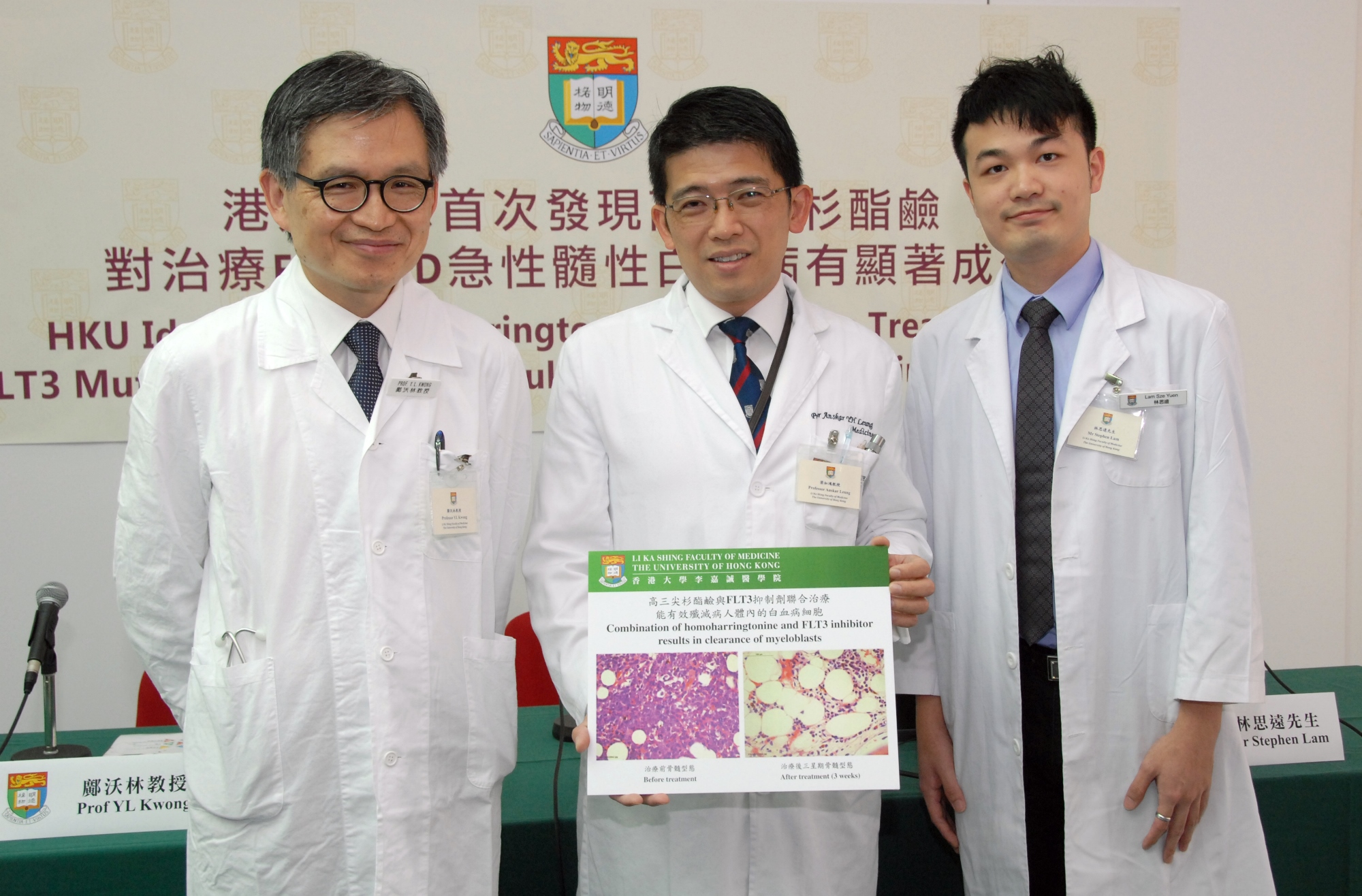 香港大學(港大)李嘉誠醫學院全球首次發現由植物提煉出的高三尖杉酯鹼及FLT3 抑制劑可有效殲滅急性髓性白血病患者體內的白血病細胞,使患者壽命得以延長,且副作用很少。這項硏究更開拓了體外藥物篩選作為急性髓性白血病用藥指導的新硏究方向,並獲得國際科研界的認可。此突破性研究剛於本月刊載於國際著名期刊《科學轉化醫學》(Science Translational Medicine)。