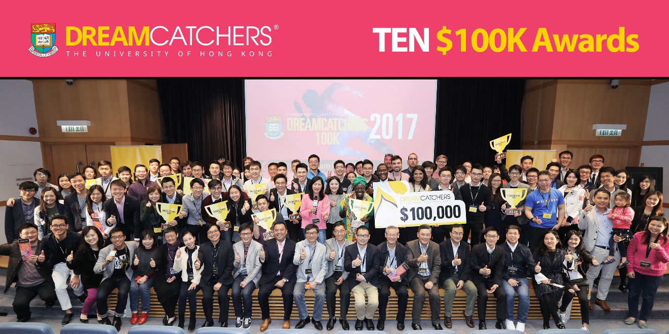 「DreamCatchers 100K」創業種子基金比賽於2016年11月開始接受報名,吸引逾300名學生及年青校友參加,經過多月以來的初選及專業導師訓練,共20組創業隊伍晉身決賽,於限時內向評判施展渾身解數,展示其創業計劃或原型產品,角逐10個十萬元種子基金名額。