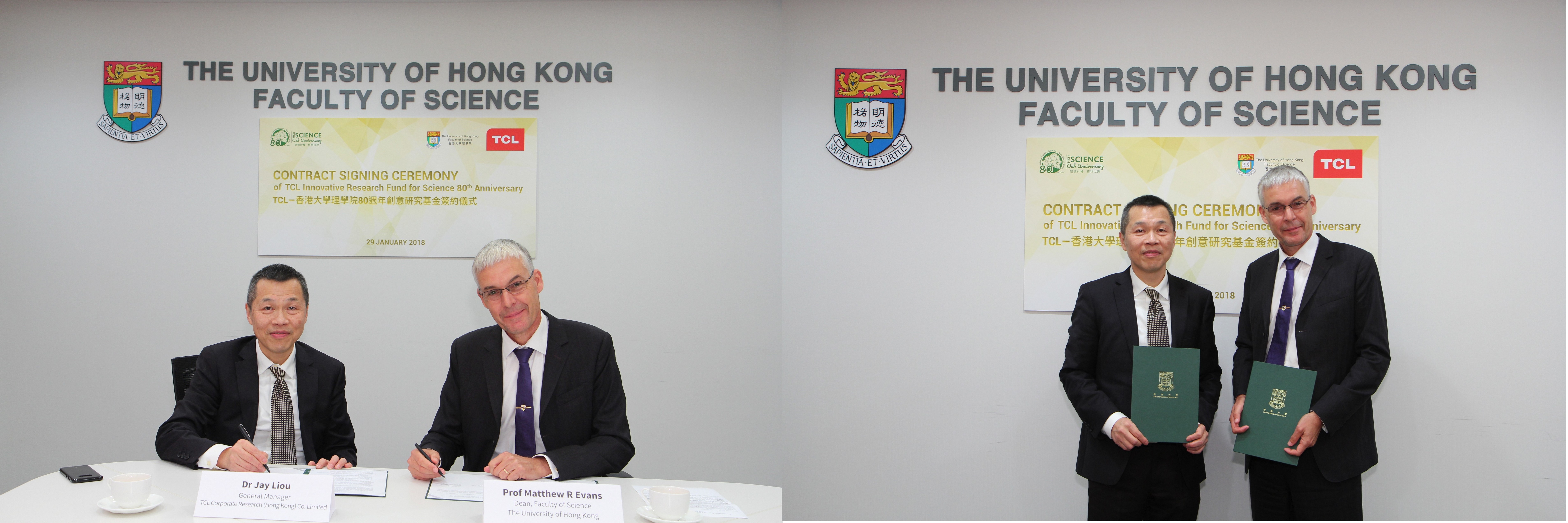香港大學和TCL集團工業研究院(香港)有限公司今天(1月29日)簽訂協議,成立「TCL—香港大學理學院80週年創意研究基金」,協議TCL將分兩階段捐助320萬予港大,以資助各科研領域博士生的研究項目。簽約儀式分別由TCL集團工業研究院(香港)有限公司總經理劉遠昭博士和港大理學院院長艾宏思(Matthew Evans)教授代表雙方進行。