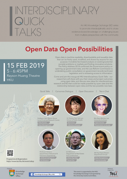 In this inaugural HKU Interdisciplinary Quick Talks, our researchers will share with you their views and project outcomes using open data, and discuss new ideas for interdisciplinary research and knowledge exchange that could be made possible by open data and the relationship between open data and the two possible new laws. There will also be an open discussion session for speakers and participants to exchange views.