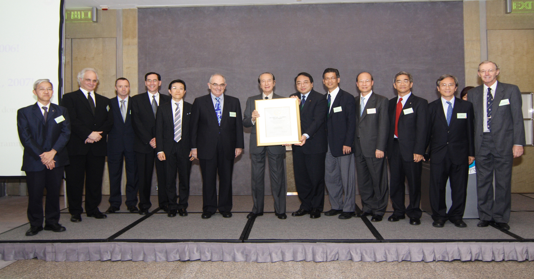 | 港大校長徐立之教授 (左八)感謝何鴻燊博士(左七)對大學的支持。「何鴻燊校友挑戰計劃」獲CASE (Council for Advancement and Support of Education「高等教育促進及支援協會」) 頒發2007年籌款項目組別的卓越金獎 (Circle of Excellence)。圖為徐校長與何博士、各院長及挑戰計劃委員會成員蘇樹輝博士合照。 |