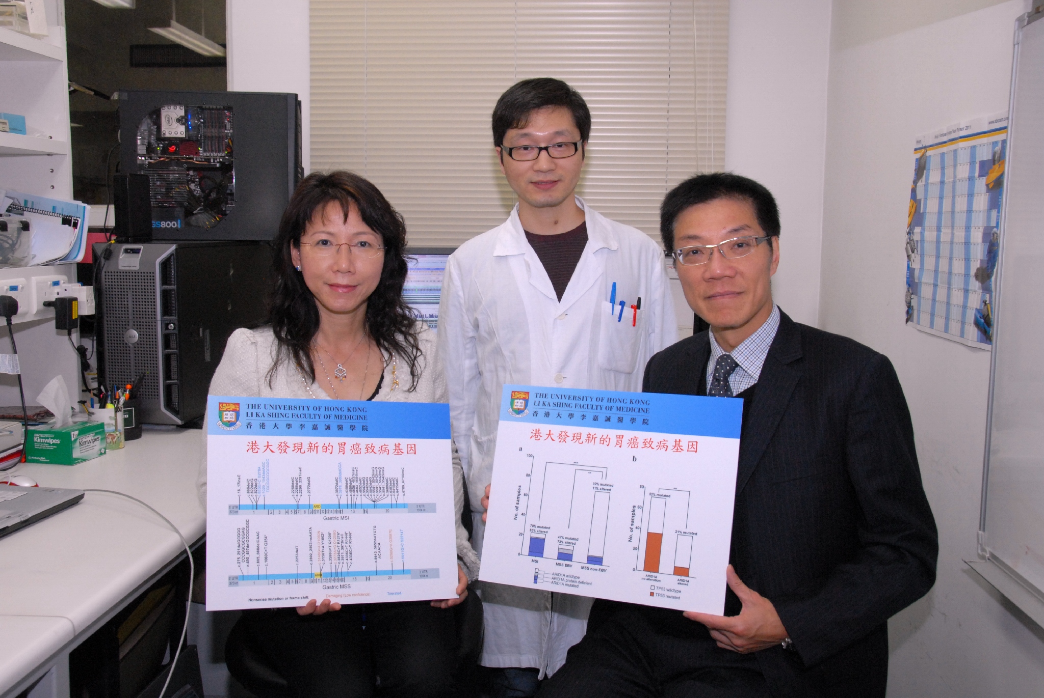 胃癌是香港第六位最常見的癌症,是所有癌症中死亡率最高的第四位,每年新發病例逾千人,有600多人死於此病。胃癌由基因突變引發,但醫學界並不知道一個胃癌會有多少個突變基因。最近香港大學李嘉誠醫學院病理學系進行一項研究,利用先進的基因組技術,揭示胃癌的所有基因突變,並發現20個胃癌驅動基因,而其中一種名為ARID1A的腫瘤驅動基因,在某種類型的胃癌中突變率高達70%到80%。發現及鑒定這些致癌的基因突變有助開發全新藥物或試用現有的標靶藥物,專門針對殺滅帶有基因突變的癌細胞,而不影響正常細胞,此發現對發展胃癌治療帶來了新方向。是項研究成果剛發表於最新一期國際權威學術期刊《自然 遺傳》上。