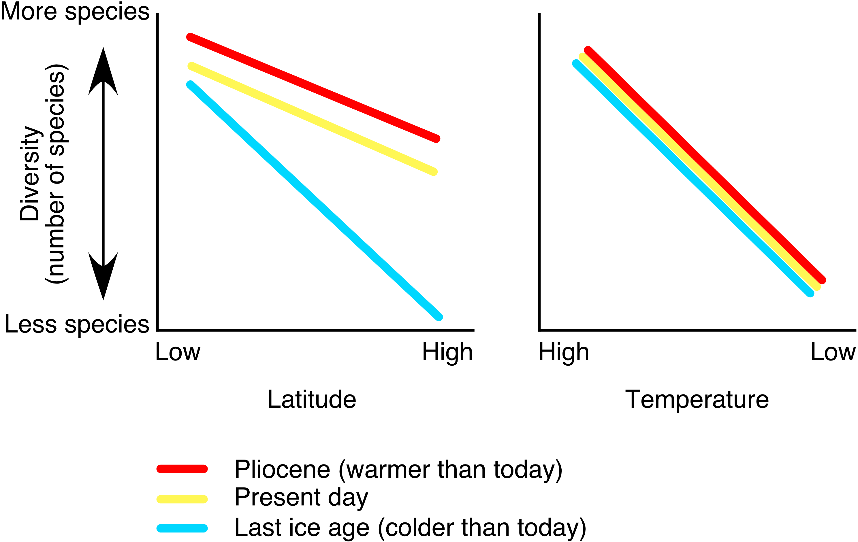 地球生態系統最顯著的特徵之一就是在熱帶地區有著較多的物種,而兩極地區則有較少。例如熱帶雨林比北極苔原有更多物種,而珊瑚礁的魚類遠遠超過寒冷海洋地區。這一現象被稱為「物種多樣性的緯度梯度效應」。目前,人類對於這種緯度或溫度與生物多樣性之間的關係,是否隨著時間而有所變化知之甚少。過去曾有科學家提出多個可能影響生物種類數目的原因,包括生物進化和滅絕等,但此研究發現,溫度是決定生物多樣性的主要因素。