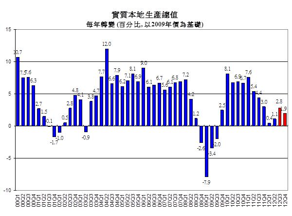 香港大學經濟學教授王于漸指出:「預料香港實質本地生產總值由上半年增長的0.9%,加快至下半年2.3%。產出增長加速反映了有形外貿回升。預期全年實質本地生產總值的增長為1.6%,相比2011年全年則為5.0%。今年實質本地生產總值增長主要由本地需求所驅動,外部需求對經濟增長貢獻為負值。在全年實質本地生產總值的1.6%增長中,估計本地需求增長貢獻了3.3個百分點,而外部需求則拖累1.7個百分點。」