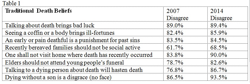 This study also revealed that some traditional Chinese taboos on death has diminished in today's society (Table 1). Particular, the public are increasingly disagreeing with the notions that “one shall not visit home where death has recently occurred”, and “talking to a dying person about death will hasten death”, and “dying without a son is a disgrace”. Having said that however, 30% of survey respondents still believed that bereaved families should not be socially active for death is polluting and brings bad luck. About 14% still believed that talking to a dying person about mortality will accelerate the dying process, and another 17% believed that elderly parents should not attend their decedents' funeral for early deaths are considered unfilial. All of these longstanding taboos continue to have a negative impact on the governance of morality among Hong Kong and its people, highlighting the imperative of adopting a public health approach in pushing forth a continuous regime of public life and death education.