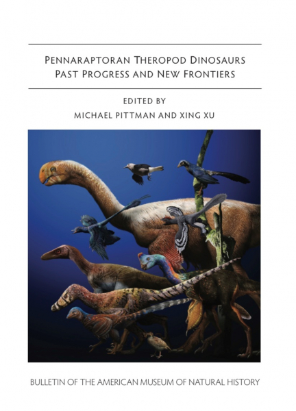 Figure 1. ‘Pennaraptoran Theropod Dinosaurs: Past Progress and New Frontiers’, a landmark volume on the biology and evolution of early birds and their close relatives. The volume comprises of 14 chapters authored by 49 authors from more than 10 countries. Fossil pennaraptorans come in a huge array of shapes and sizes and lived in a range of habitats. However, they shrank drastically in their successful conquest of the skies. Today, they are only survived by the birds. Image credit: Bulletin of the American Museum of Natural History & Julius T Csotonyi.