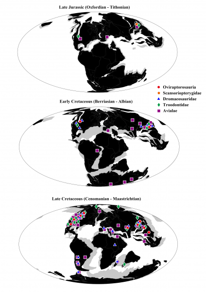 Figure 3. Pennaraptoran fossil localities through time. Pennaraptorans became globally widespread before the end of the Cretaceous and lived in a range of habitats including hot deserts and temperate forests. Image credit: Pittman et al. 2020.