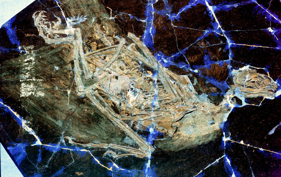 Figure 5. The early short-tailed fossil bird Sapeornis. Under Laser-Stimulated Fluorescence, the feathers and other soft tissues preserved around the fossil skeleton become clear. This new information is used to refine the reconstruction of its soaring abilities. This specimen STM 15-15 is ~30cm long. Image credit: Serrano et al. 2020.