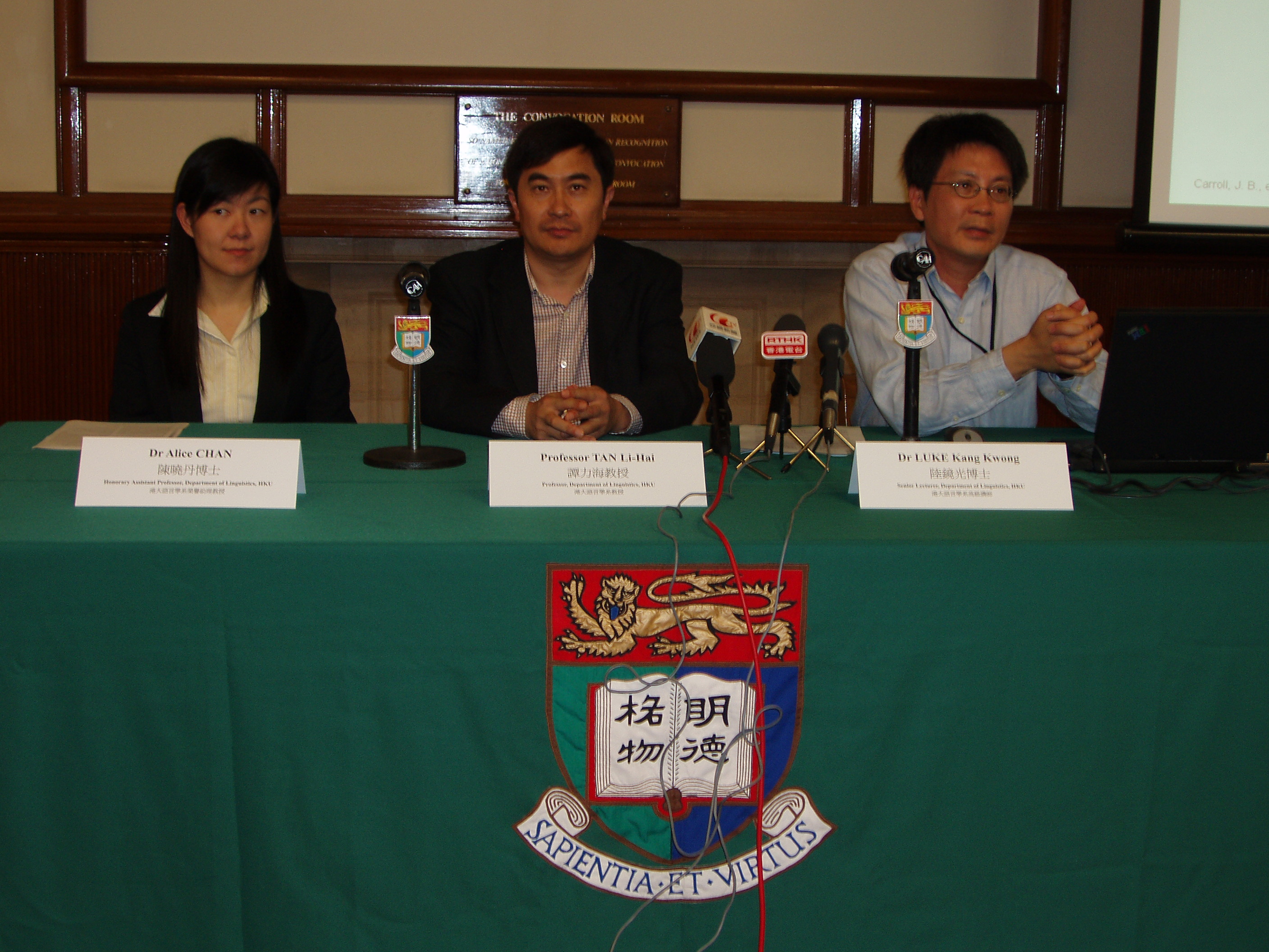 (From right) Dr LUKE Kang-Kwong, Professor TAN Li-Hai and Dr Alice CHAN of HKU's Department of Linguistics Dr LUKE Kang-Kwong, Senior Lecturer, Department of Linguistics, HKU explaining the study findings to journalists. |