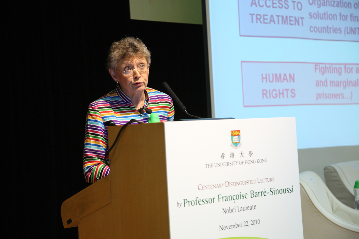 As part of its 100th anniversary celebrations in 2011-2012, the University of Hong Kong (HKU) is proud to present a series of Centenary Distinguished Lectures. The second lecture was delivered today (November 22) by Professor Françoise Barré-Sinoussi, recipient of Nobel Prize in Physiology and Medicine in 2008.