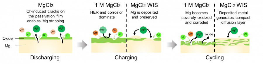 The team also found that the adsorption of chloride ions can protect the Mg surface by partially dissolving oxides and exposing native metal for redox reactions. With limited free water, the chloride-based water-in-salt electrolyte successfully combats magnesium passivation.