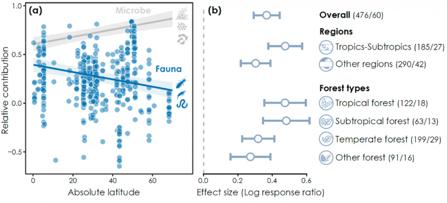 Soil invertebrate contributions to forest litter decomposition across regions. (a) Relative contributions of invertebrates (blue) and microorganisms (grey) to forest litter decomposition against absolute latitude. (b) Effect sizes of invertebrates on forest litter decomposition at global, regional, and biome scales. (Illustration adapted from respective paper)