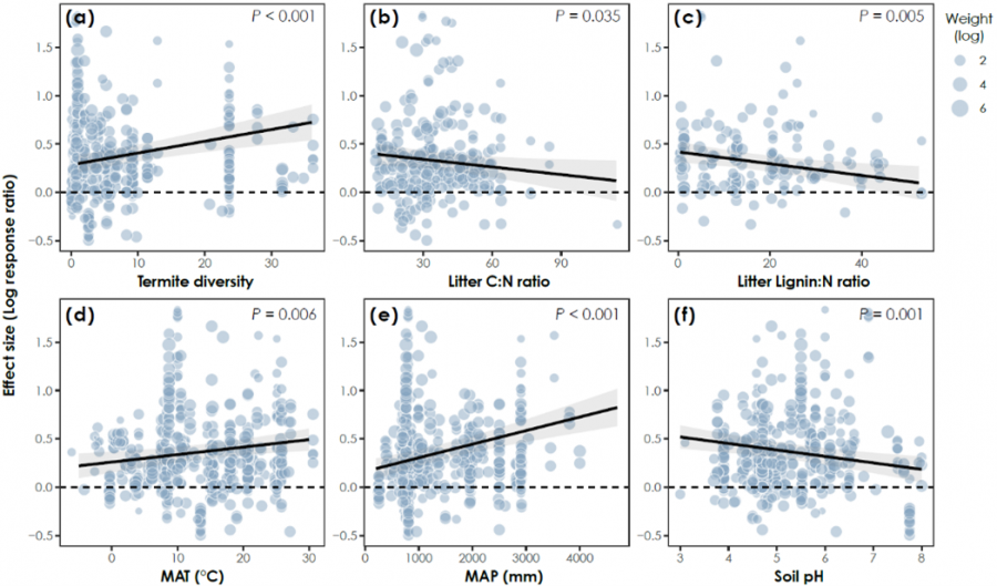 This study highlights the global importance of invertebrates in driving the decomposition of forest litter, particularly in tropical and subtropical regions. However, the contribution of invertebrates to forest litter decomposition may be underestimated due to the current regional sampling bias. Additionally, this study highlights the importance of termites in nutrient cycling. Many still consider termites as crop pests and widely use insecticides to reduce termite abundance. Conservation of invertebrates in tropical and subtropical regions is crucial for maintaining ecosystem services, given the widespread environmental change in these areas.
