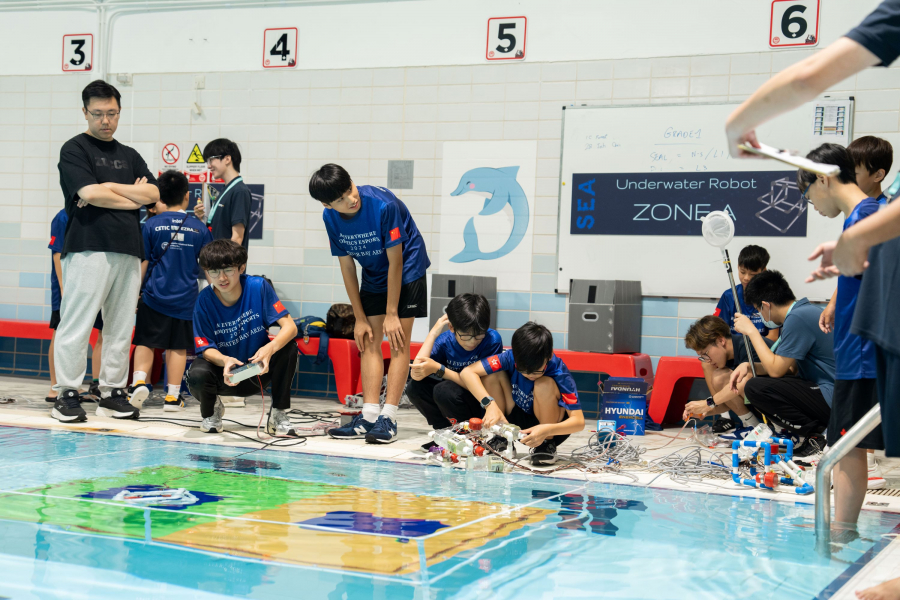 In the “Sea: Underwater Robot Sumo Tournament”, students were tasked to demonstrate strategic planning and robotic skills as they maneuvered their sumo robots to push opponents out of a designated underwater zone. For the “Land: Robot 3x3 Rugby Tournament”, students were required to strategically manipulate their robots in a simulated rugby match to traverse the field and deliver the ball to the opposition’s touchdown area to score points, testing their teamwork, strategic planning, and robotic control skills. Meanwhile, the “Air: Drone Dance Competition” showcased the students’ creative and programming skills as they choreographed and executed a synchronised aerial performance using drones.