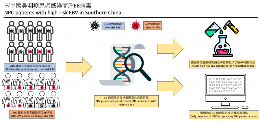 A HKUMed research team conducted a meta-analysis of genome-wide association studies (GWAS) of two datasets from Hong Kong and one dataset from Guangdong province, comprising a total of 279 and 227 EBV genomic sequences derived from NPC patients and healthy population carriers in Hong Kong and southern China, respectively. The study revealed high-risk EBV haplotype present in about 70% of NPC cases, compared to about 30% of population carriers. The use of nine genetic markers associated with a high-risk EBV lineage might help predict the presence of NPC, thus providing a potential new avenue for NPC screening and diagnosis.