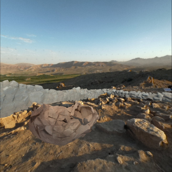 The view of Ararat Plain Southeast Archaeological Project site from within the MR headset, where both a grey stone wall and a brown pottery vessel are virtually visible in their original positions, even though they were actually removed a year earlier. (Photo credit: HKU Faculty of Arts)