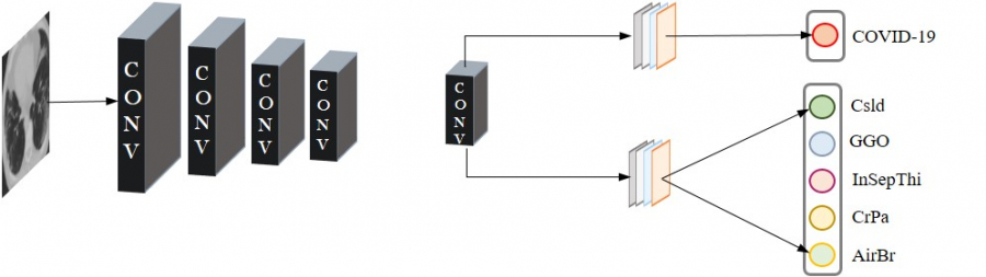 研究團隊進一步對樣本附帶的文本信息進行了針對性的研究,發現760篇論文涵蓋了對於新冠肺炎的五種病徵的描述,其中每個新冠病人CT影像上均會出現其中一種或者多種病徵,而這五種病徵是新冠疾病區分於其他肺炎的顯著特徵。於是,團隊設計出一個基於CT圖像的Lesion-Attention 深度神經網絡模型。模型一方面學習圖像中可以區分新冠病人和非新冠病人的特徵,另一方面把模型的「注意力」集中在病徵區域,即學習多標籤病徵,這就是團隊提出的LA-DNN(Lesion-Attention Deep Neural Networks)模型。如同臨床醫生通過CT圖像判斷病情時會側重關注異常的病徵區域一樣,模型同時訓練兩個任務,相互協調,從而使得模型性能得到顯著的提升。