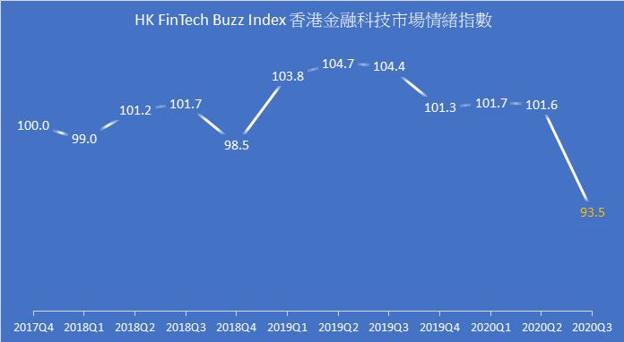2020年第三季度的香港金融科技市場情緒指數,分析了季度内1,299條有關金融科技的新聞報導,指數值跌至93.5的歷史低位,較2020年第二季度大幅下跌8.1個指數點(或7.97%),較去年同期下跌10.9個指數點(或10.4%),延續自2019年第二季度起的下跌趨勢。