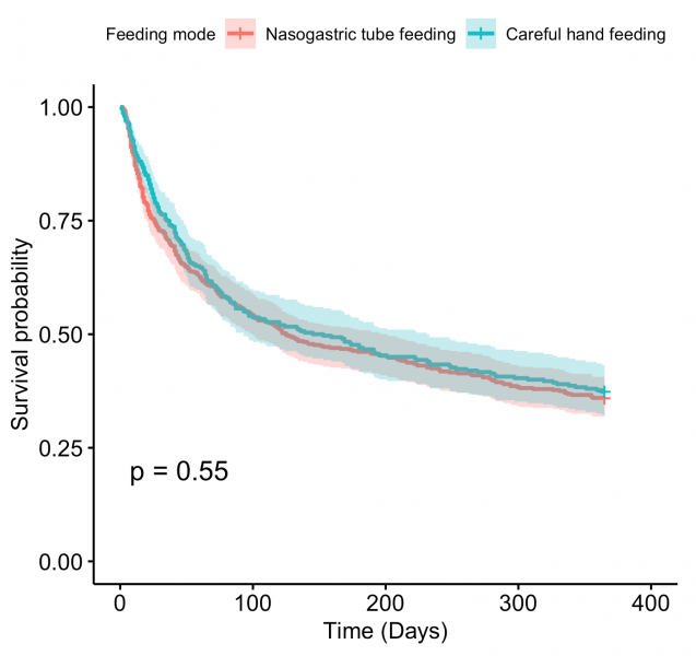 採用鼻胃管餵食及人手小心餵食兩組病人的一年存活期並沒有顯著差異,中位數分別為125及145日。