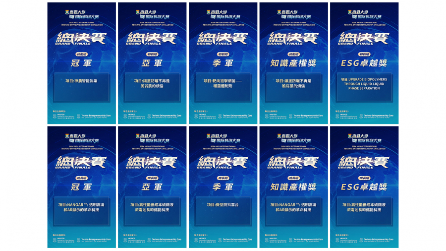 成長組別中,《nanoAR™:透明高清和AR顯示的革命技術》斬獲冠軍及本組別「知識産權獎」兩項榮譽;《高性能低成本硫鐵液流電池長時儲能技術》獲得亞軍及本組別「ESG卓越獎」;《微型防抖雲台》獲得季軍。