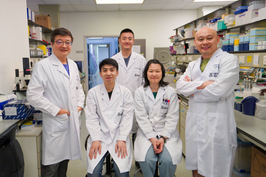 A research team led by Professor Chu Hin (first right) and Professor Chen Zhiwei (first left) has discovered that inhibiting the BRD9 protein can effectively reactivate latent HIV-1. When used in combination with other drugs, this approach exhibits significant synergistic effects, offering new hope for the development of novel treatment regimens for HIV-1 cure.